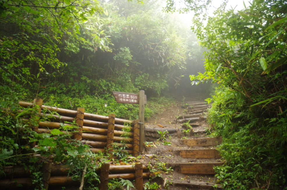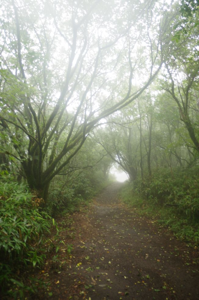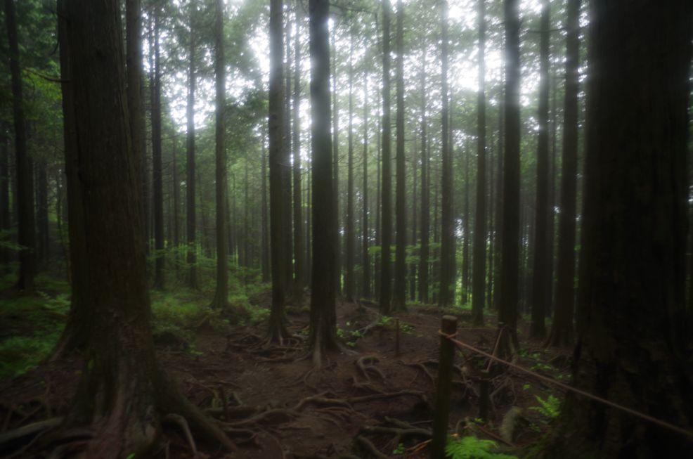 歩きずらい石だらけの道をヘロヘロになりながら下るとなんとも幻想的な杉の森に出た。