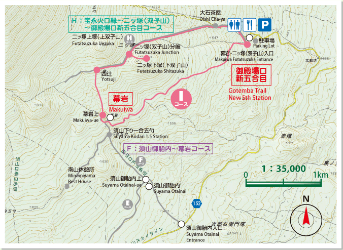 近くに溶岩が流れたらしい幕岩というところを回って二ツ塚に登るハイキングコースがあった。