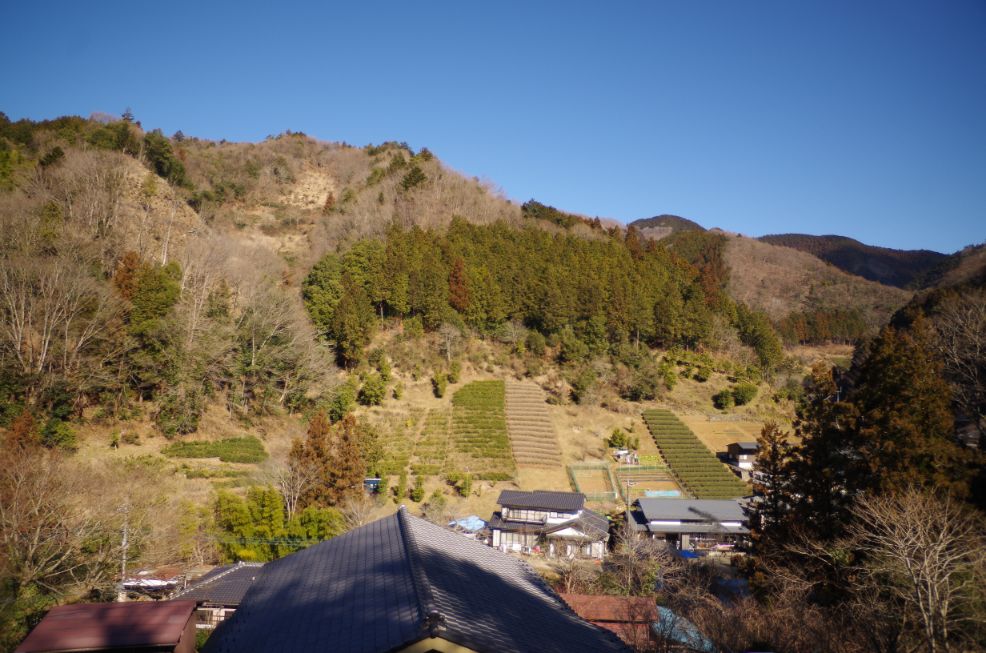 しばらく急な舗装路が続き、茶畑ののどかな風景があっという間に下になる。