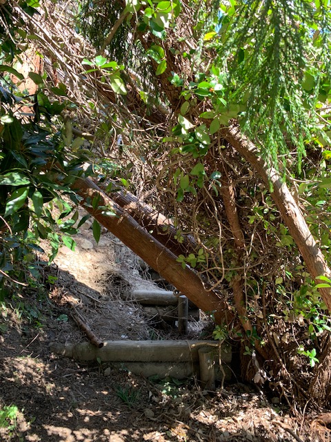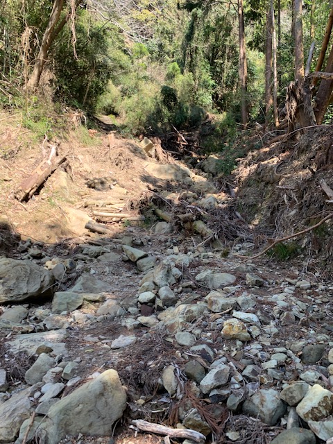 1時間30分くらい車道を登っていくと突然道がなくなった。崩れてるけど、先の道も残ってるみたいなので、いってみる。。