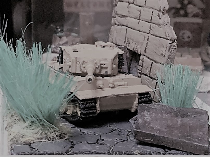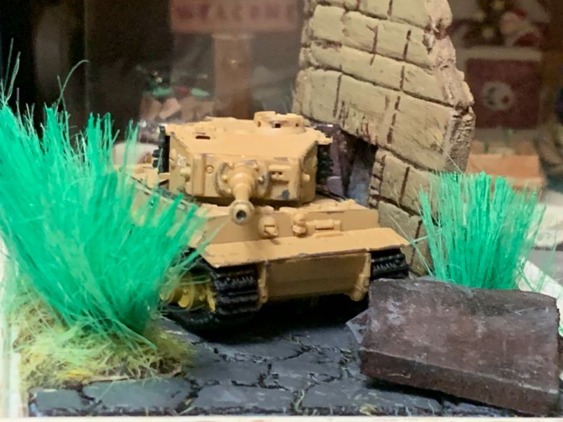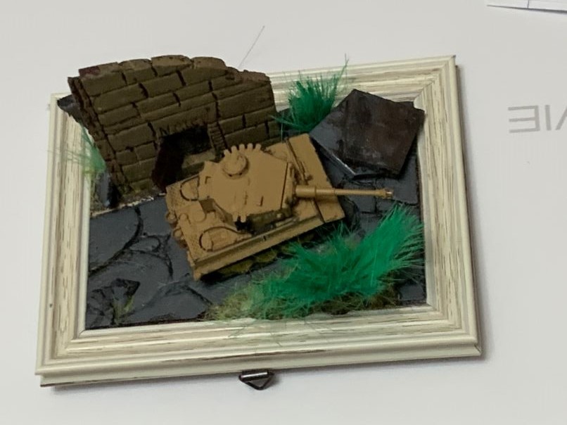 ちなみに全工程で1日ほど乾かすことが必要だったので、その間、こんなものも作ってみた。 うちに転がっていたガチャガチャでとったティーガー1を使ってみた。 写真立てに100均で買ったカラーボードで石畳っぽく模様を描いて爪でなぞったら案外よくできた。 壁は廃墟っぽくカラーボードで切り抜いた。