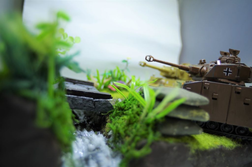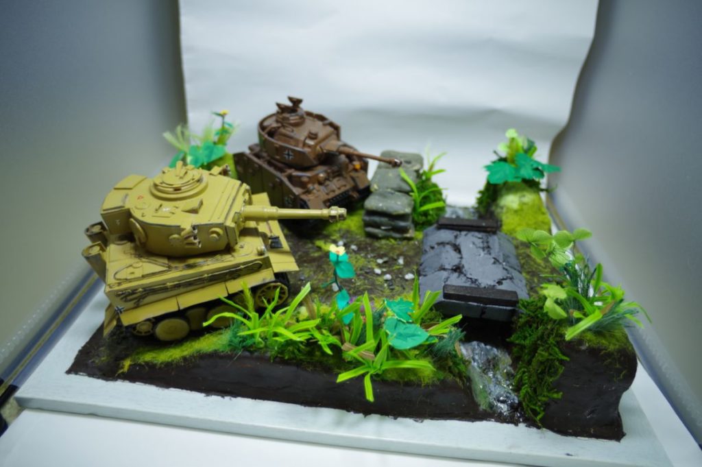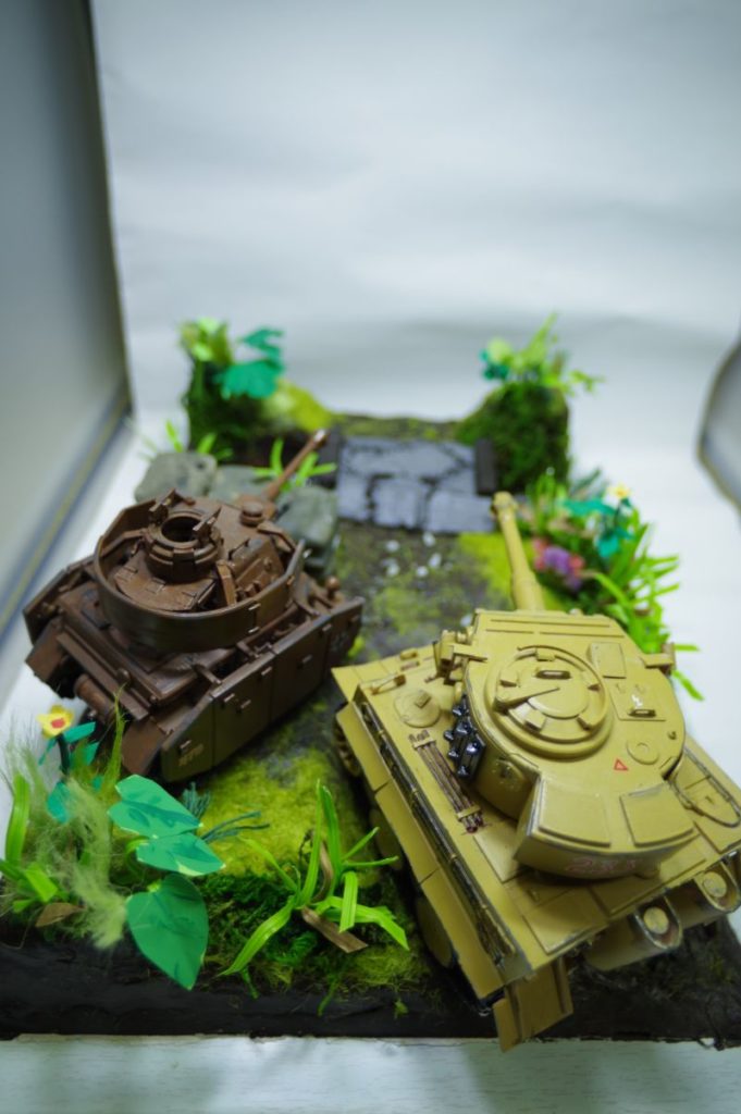 戦車以外ほぼ100均で作った。水はリキテックスのグロスポリマーメディウムとジェルメディウムを使ったけど。。