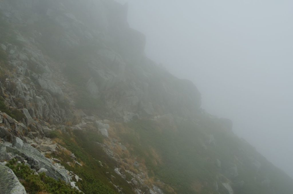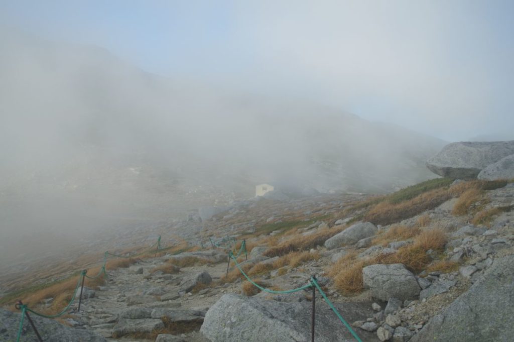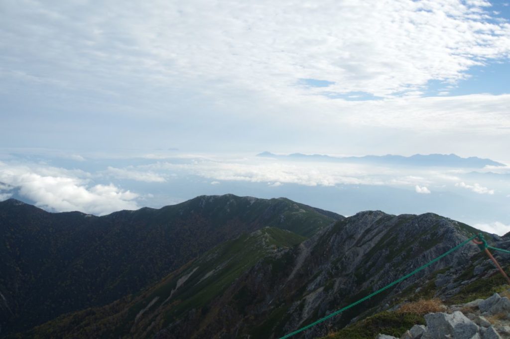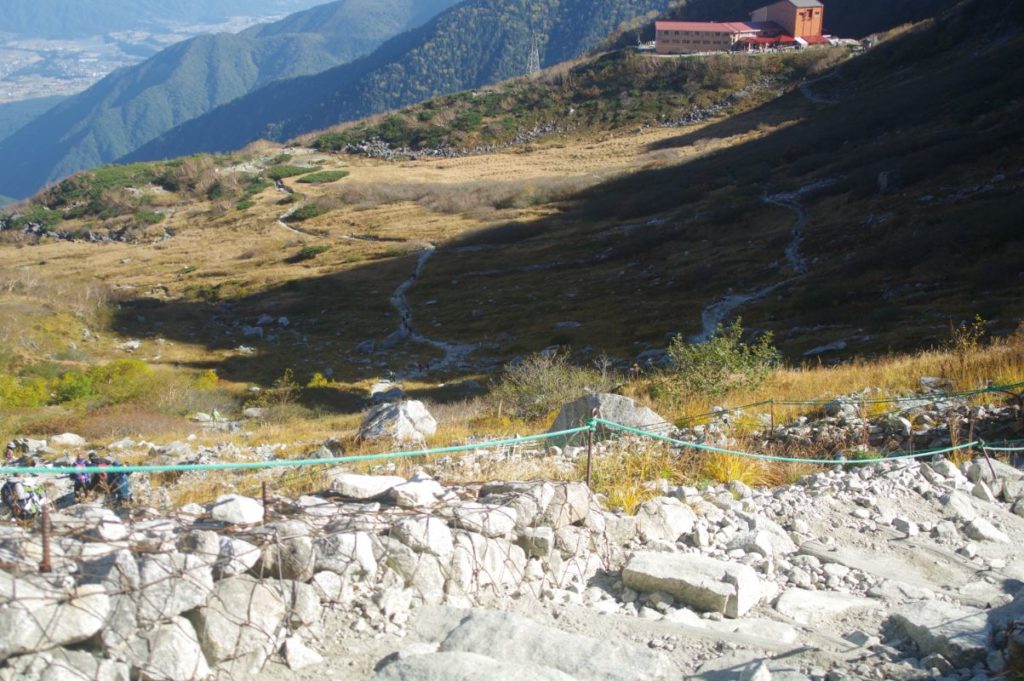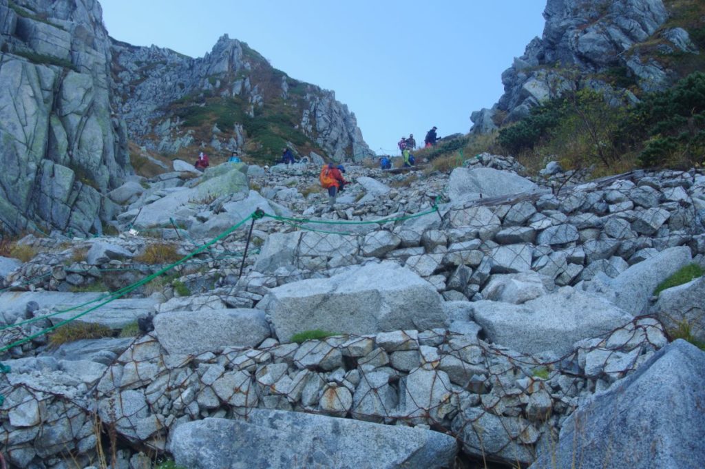 宝剣岳から宝剣山荘までもどり、中岳の巻道を超えて山頂山荘へ。 いきなりがすった。ちなみにこの巻道のほうが危険な場所があるらしい。 確かに三点支持は必要だけど、宝剣岳のあとだしね。。