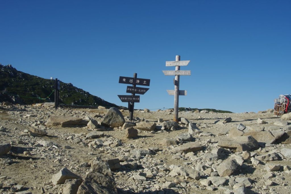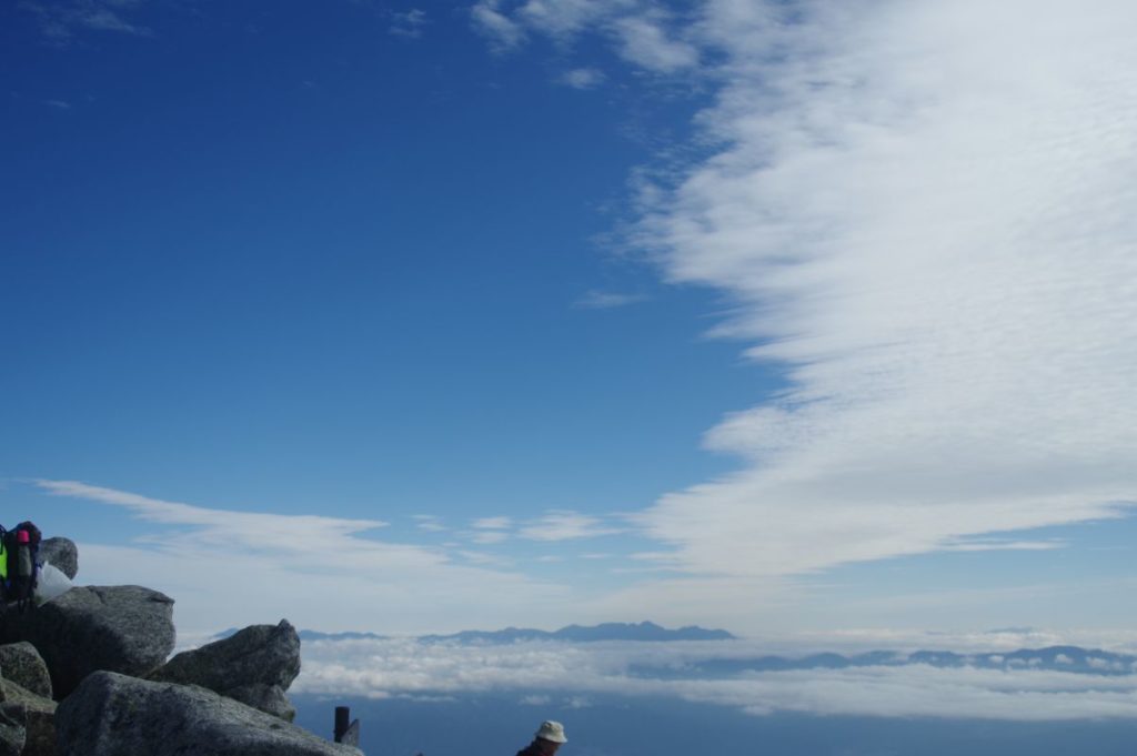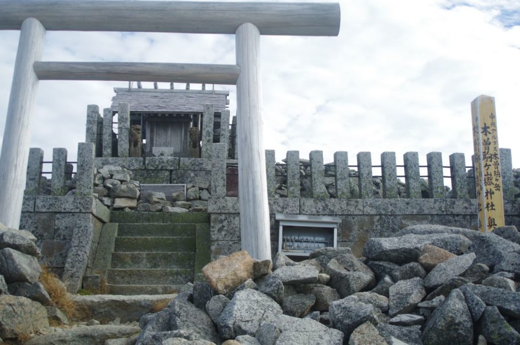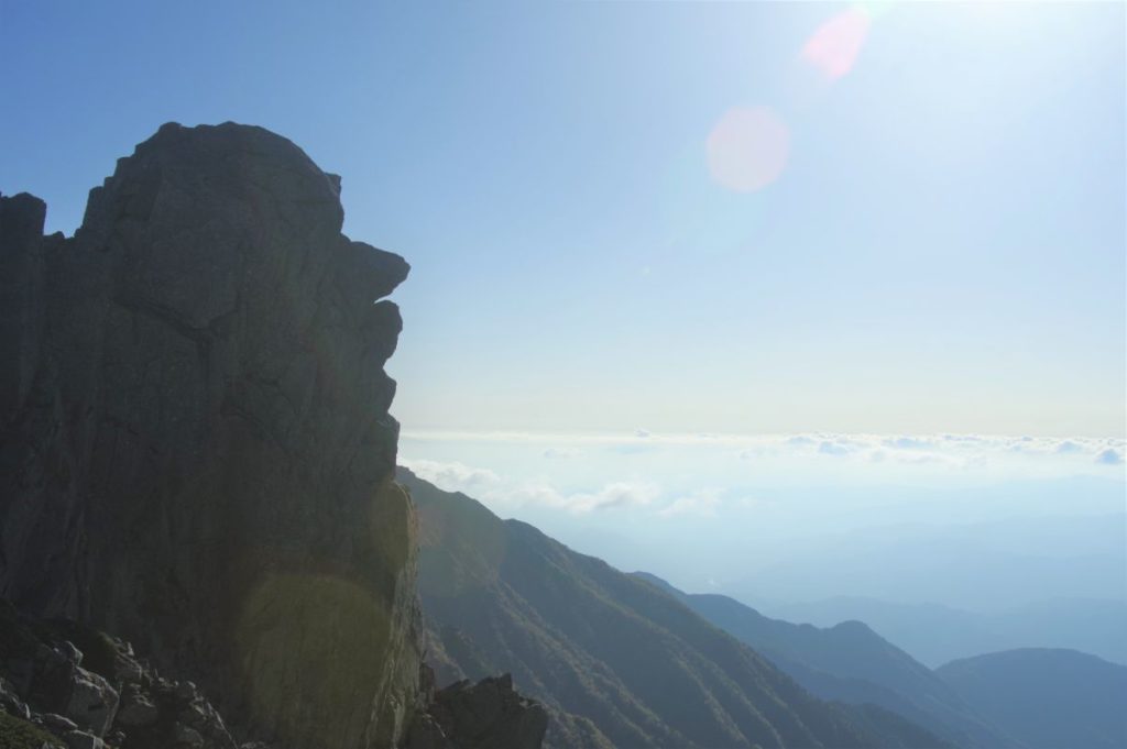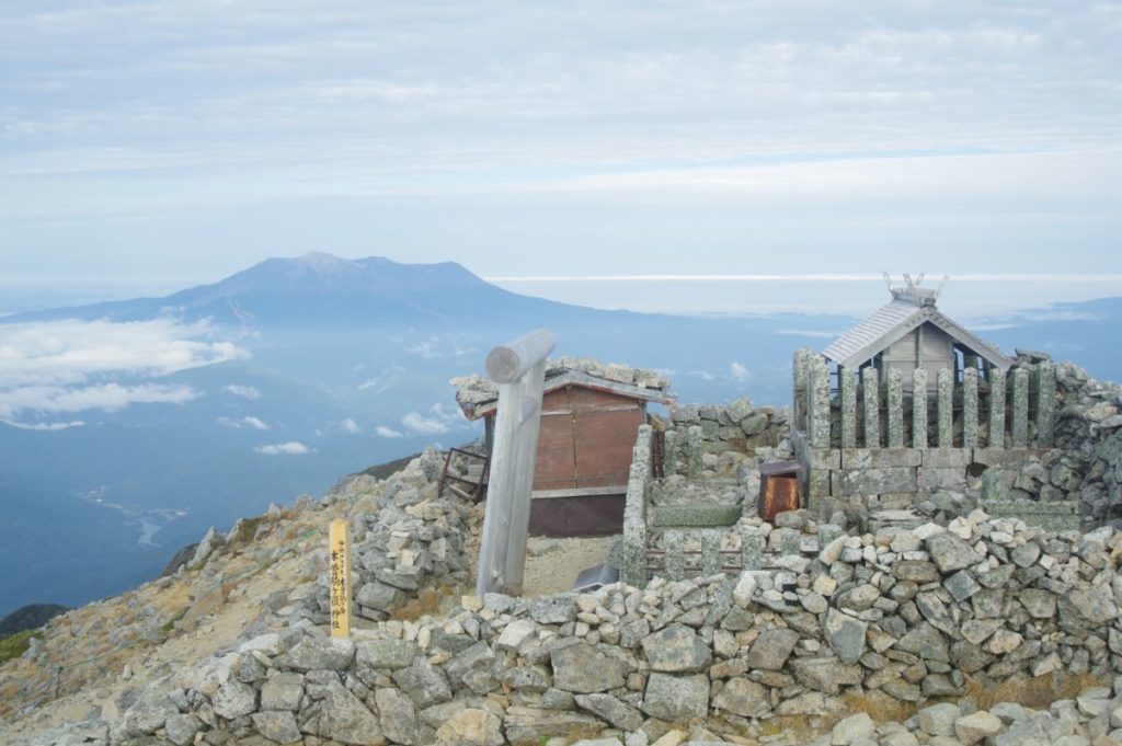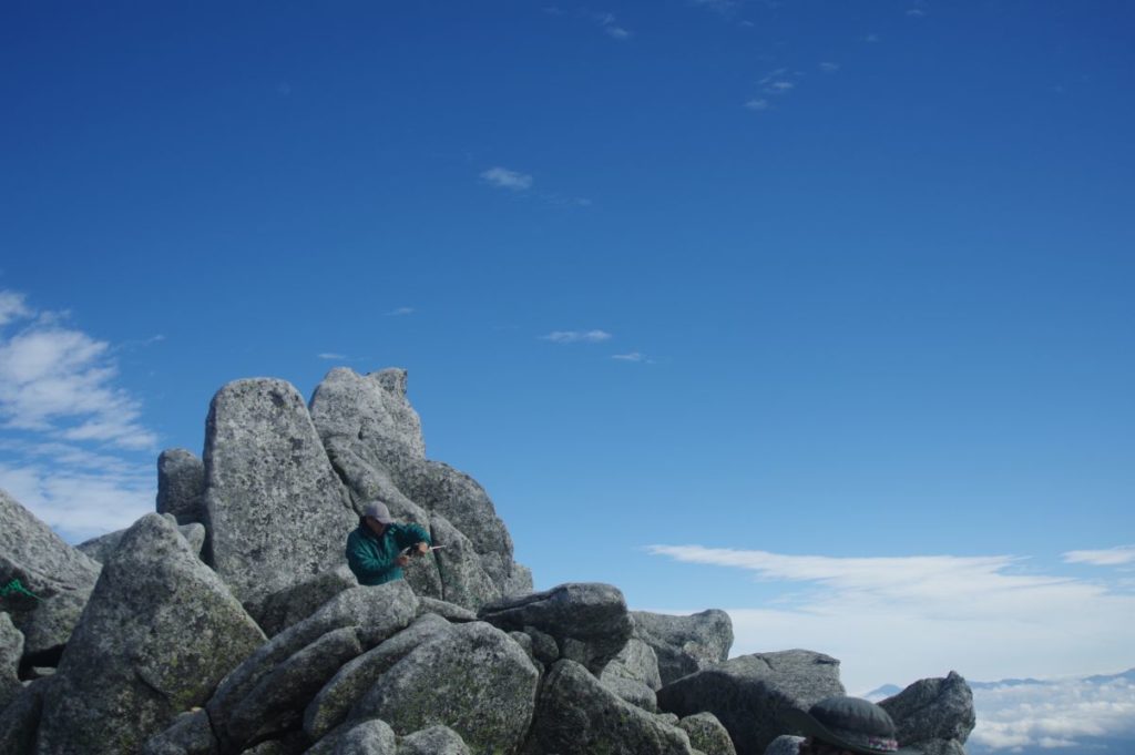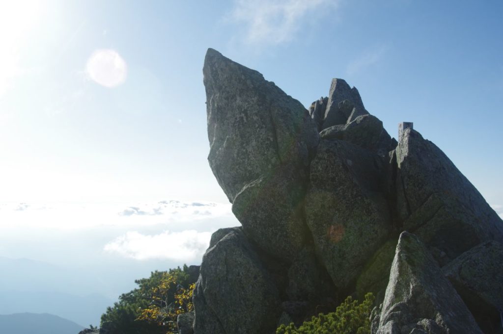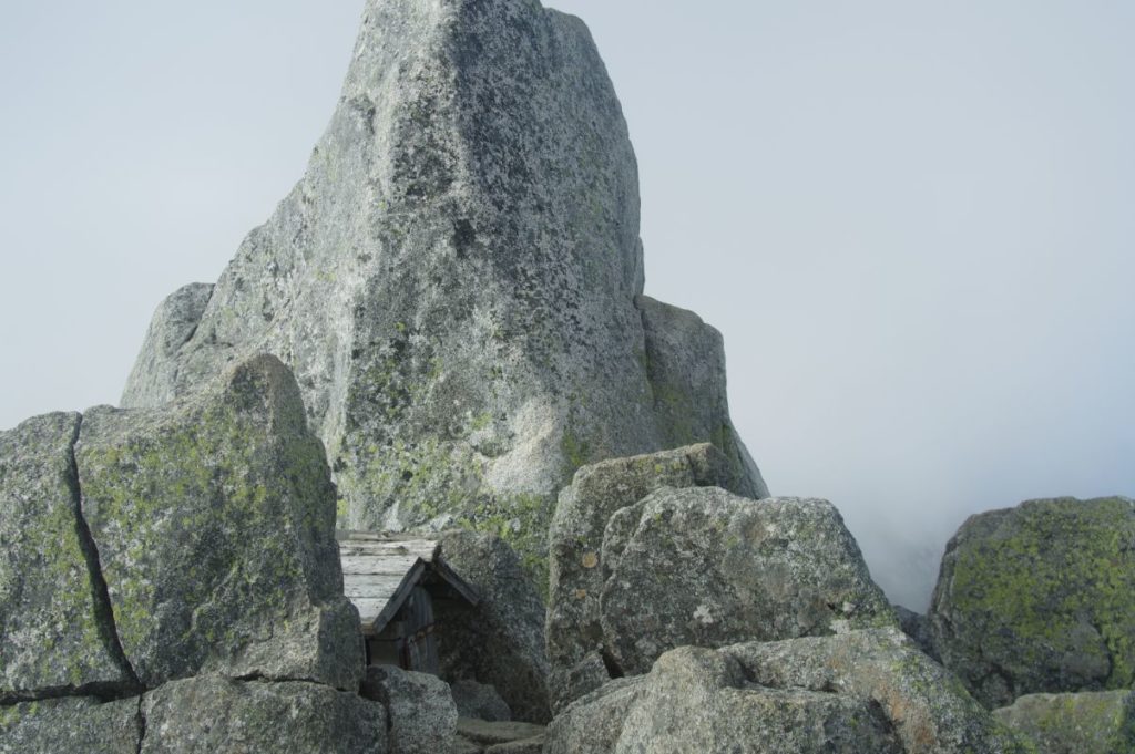 宝剣岳山頂。小さい祠があり、この岩の裏側にも祠と賽銭箱があるらしい。怖くて行けなかった。