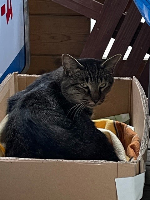 受付等にねこがいた。なんでも野生らしく、住み着いてしまったらしい。 なので、段ボールの中に毛布入れてあげたら気に入ったらしい。 でも、地下ずくと”シャー!!”っておこられた。触れなかった。。