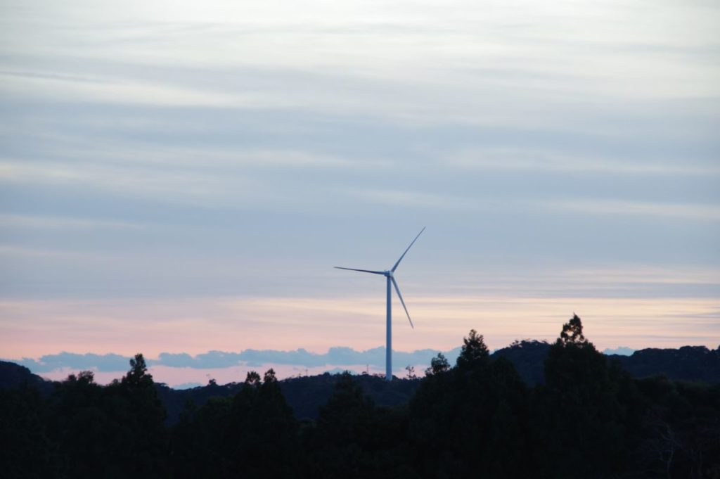 南側に風力発電のプロペラが夕焼けに映えていた。