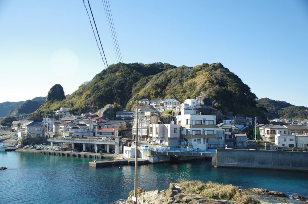 仁右衛門島から漁港をみる展望台。後ろの山が亀岩というらしい。